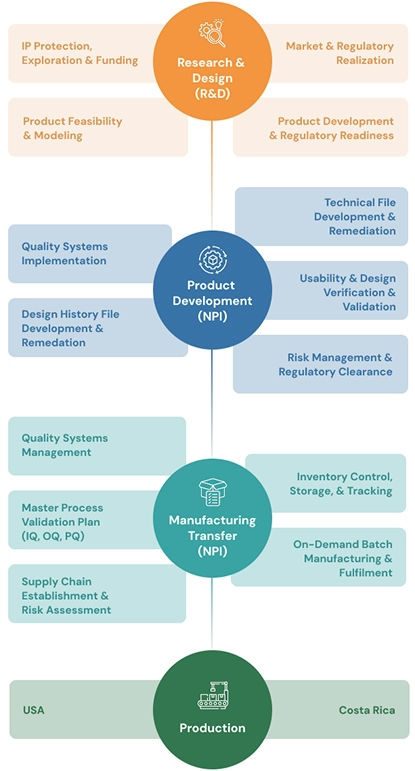 We bridge the infamous "Valley of Death" between development and production, ensuring your medical device's seamless path to market, growth, and sustained impact.